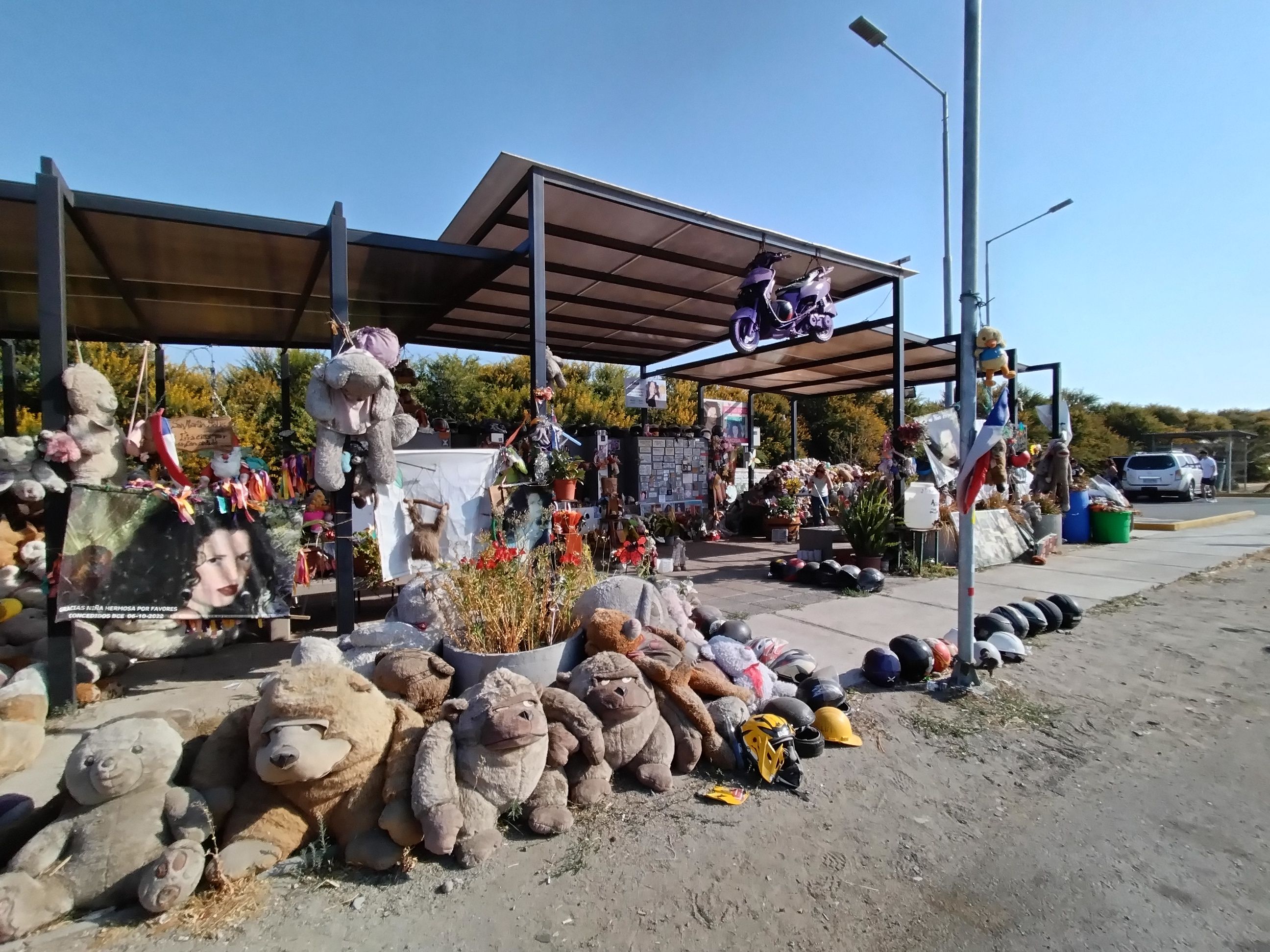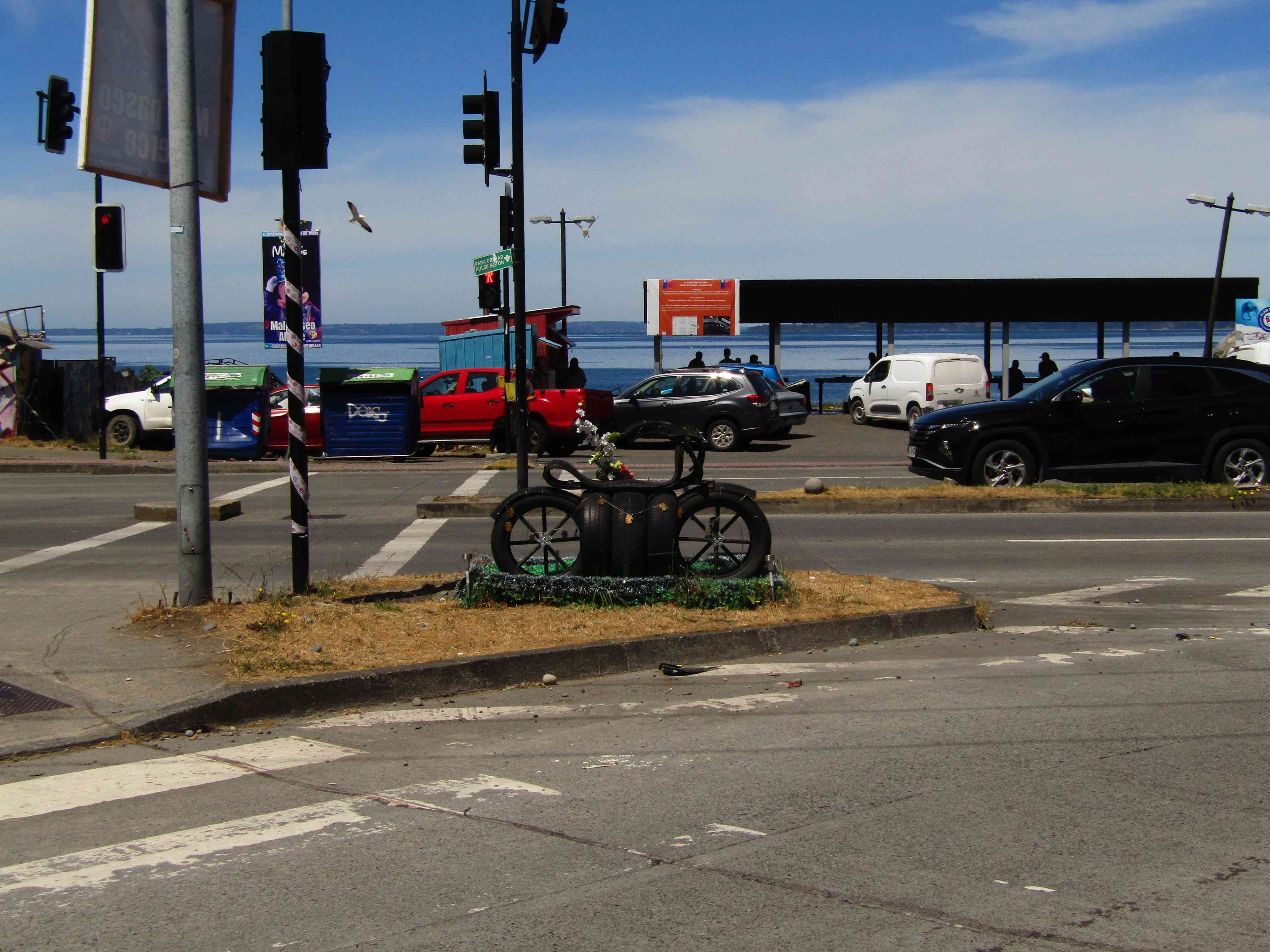 En la intersección de río Puelche con la carretera Austral está la animita de Diego. Estuve explorando animitas en Puerto durante el verano, y también conocí varias en Santiago y Valparaíso, pero la de Diego es la primera que emula una moto. Hay de bicicletas, ¿pero de motos? Solo la de él, que yo sepa. Llegué hasta una calle antes de la animita, y antes de cruzar hacia ella pasaron varios autos, lo que me dio tiempo para pensar. Desde donde estaba, parecía una moto detenida en la calle. Quiero decir: se notaba que era de neumáticos, pero la silueta calzaba perfectamente con la vía desde mi perspectiva. Pensé que era como ver un fantasma, pero no en el sentido “¡Buuu!”, que te quiere dar susto, sino más bien como el eco de algo que pasó y que ahora busca decirles a las personas: ‘¡Ten cuidado!’.