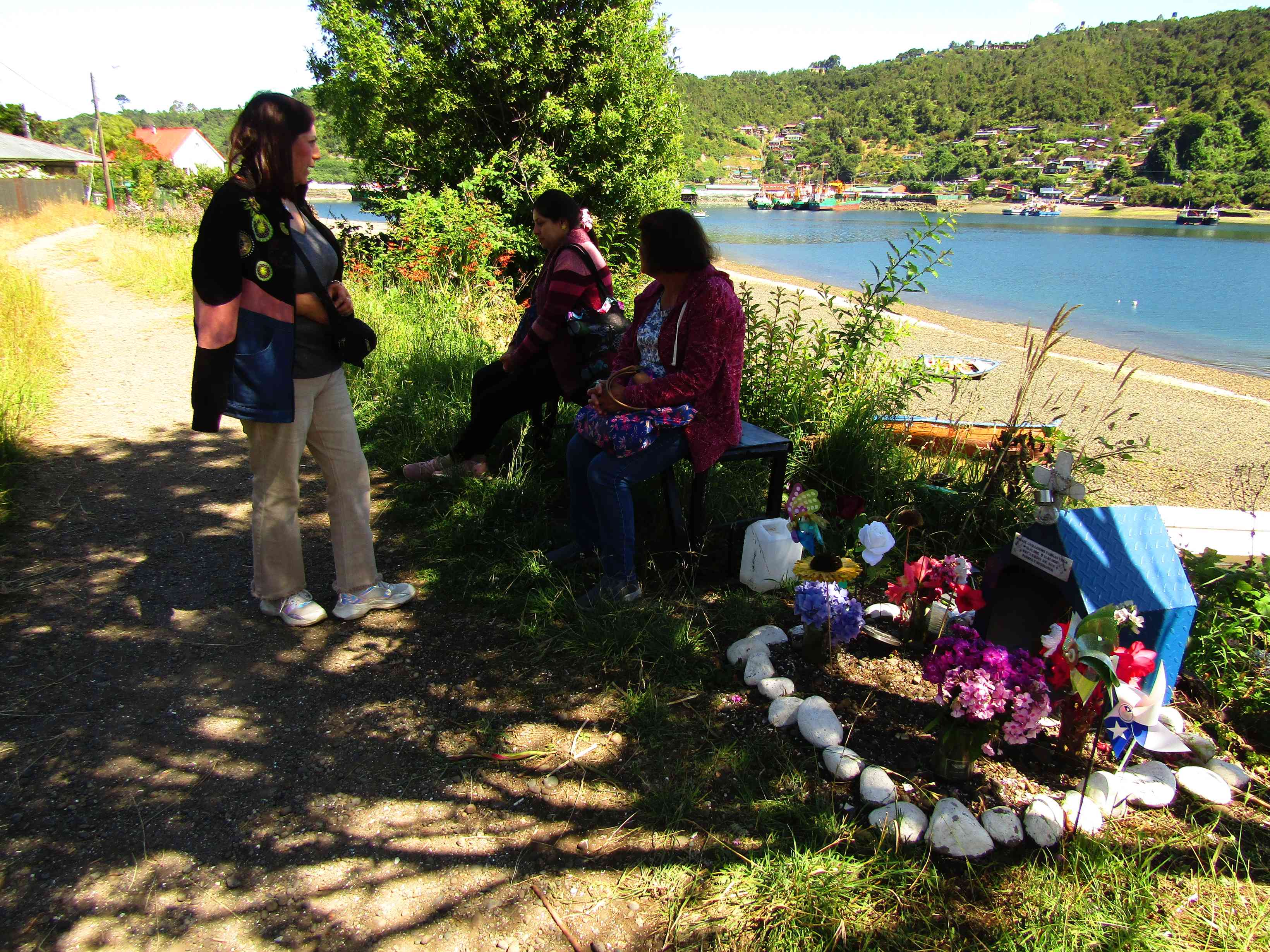 “En la costanera de Castro, justo donde el puerto se abre al vaivén del mar y del viento, la animita de Paola se afirma con carácter. Tenía 27 años cuando un conductor bajo los efectos del alcohol y las drogas le quitó la vida en este lugar. Hoy, su memoria vive entre flores frescas y dos molinillos grandes que giran alegres, movidos por la suave brisa marina. La animita no pasa desapercibida: es colorida, firme, con algo de presencia alegre, como si dijera que aquí aún hay vida, a pesar de todo. Ese día primaban los turistas, gringos altos con gorros de pescador y cámaras colgadas al cuello. Se detenían brevemente frente a la animita, la observaban con curiosidad por unos diez segundos, luego seguían su camino. Uno de ellos me vio tomando una foto, y se detuvo unos segundos más, quizás preguntándose qué veía yo que él no había visto”.